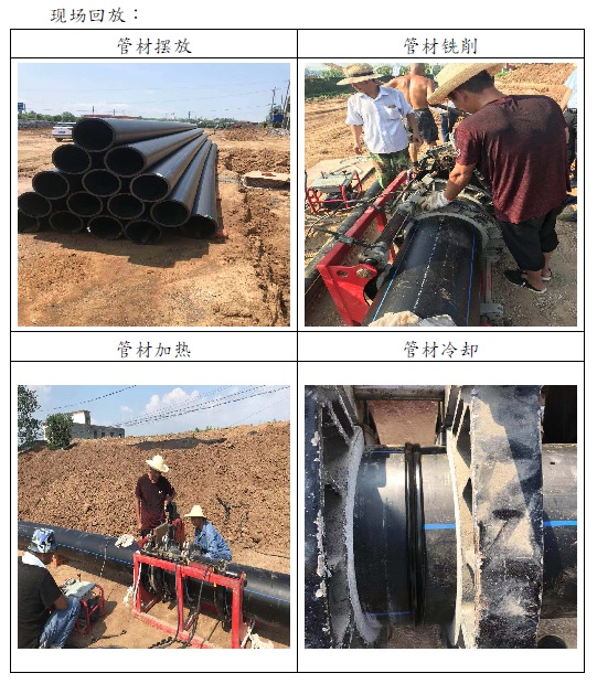 2019年7月26日公司派员至信阳某地施工指导,该项目为自来水管网工程,本次管网铺设PE给水管规格400*23.6,现场讲解管材存放、搬运、管材焊接及焊机操作等事项,确保后续通水正常。